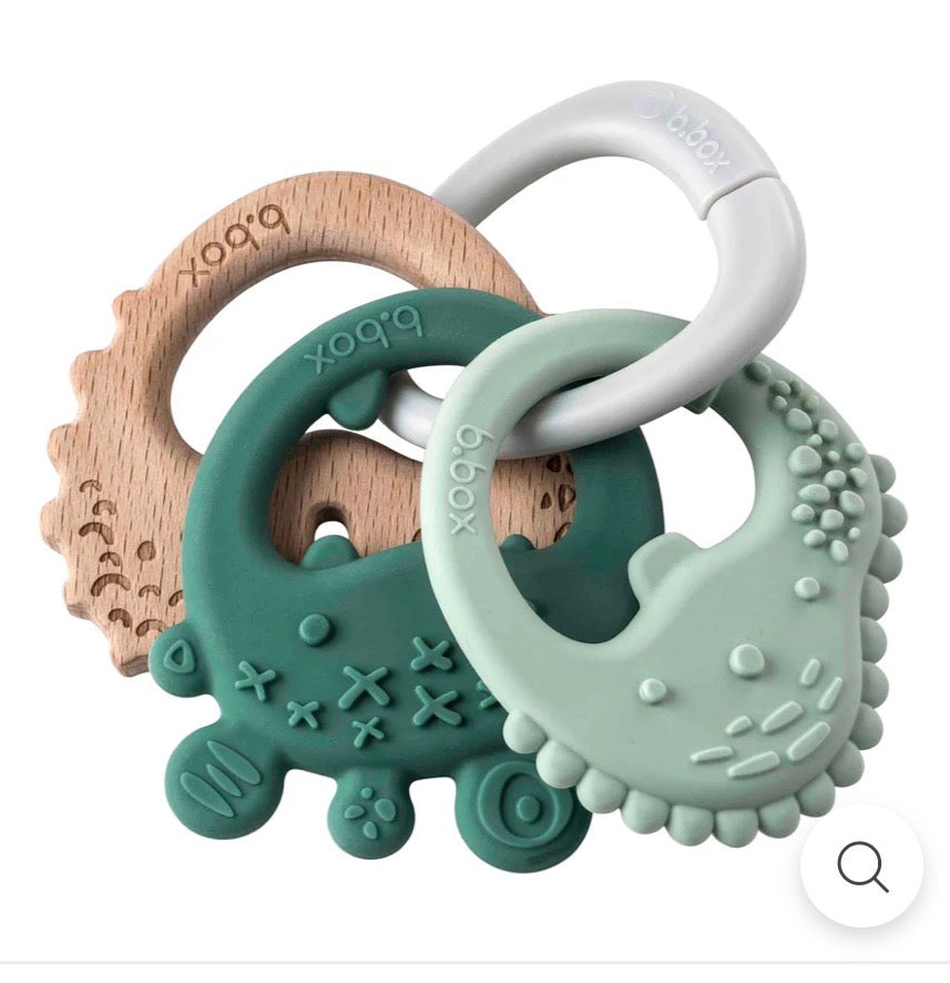 La dentition trio est composée de trois dentitions texturées sur un anneau pratique offrant le choix du silicone et du bois de hêtre tout au long du parcours de dentition. Léger et facile à tenir, utilisez-le individuellement ou en tant qu'ensemble avec une fixation d'anneau personnalisable pour soulager les gencives douloureuses  et stimuler le développement sensoriel. Convient à partir de 3 mois et conçu pour grandir avec bébé.
