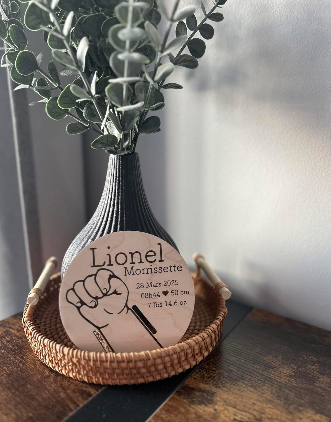Pastille de naissance, faite entièrement à la main en bois d’érable, et gravée au laser.
