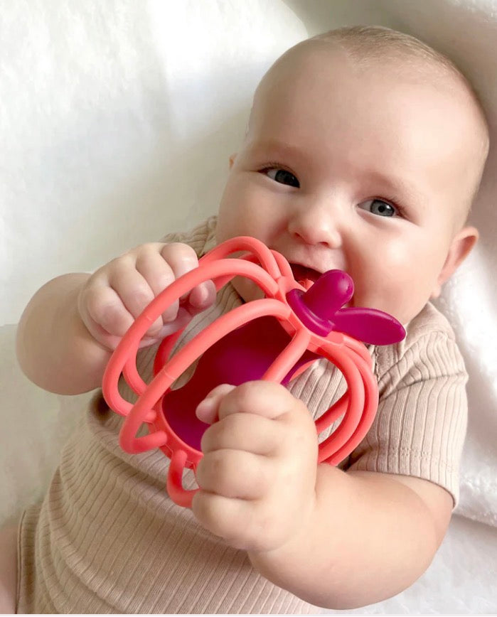 Peluche et un anneau de dentition en silicone en forme de perle sarcelle cousu. Boucle cousue sur le dessus pour accrocher. Parfait pour bébé. Lavage en machine, séchage à l'air libre.